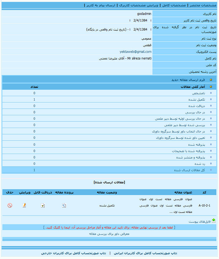 در بخش زیر می توانید نمونه صفحه شخصی یک کاربر که برای مشاهده یا ویرایش مشخصات خود و نیز بررسی وضعیت مقاله یا طرح ارسالی خود مشاهده می کند مشاهده کنید.