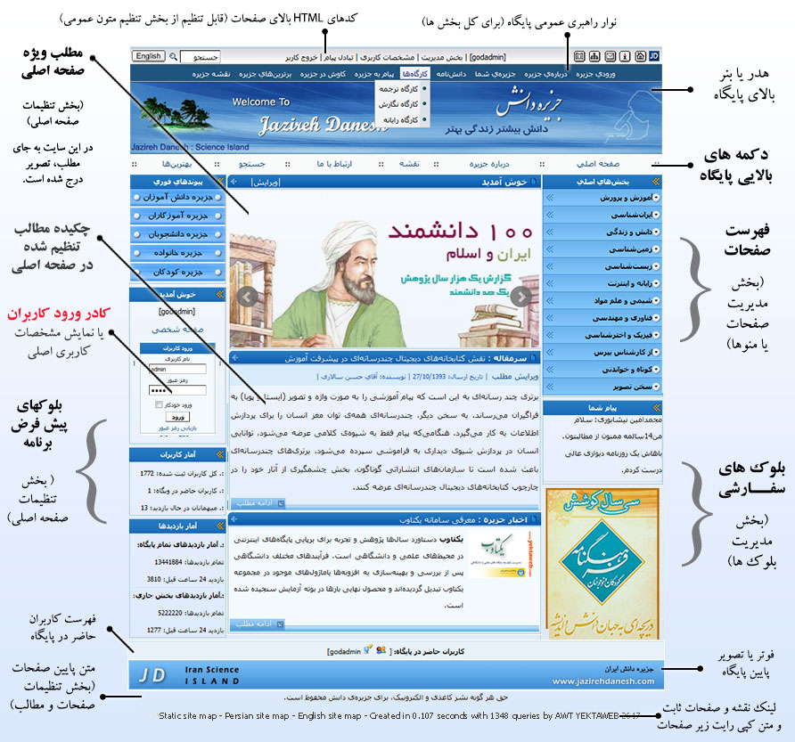 بازدید کنندگان سایت می توانند صفحه اول پایگاه را مشاهده کنند، صفحات و مطالب پایگاه را بازدید کنند، در پایگاه عضو شوند و با پر کردن فرم ها اطلاعات و نظرات خود را ارسال کنند. در زیر می توانید نام اجزای اصلی صفحه اصلی را مشاهده کنید تا بتوانید برای مدیریت و تغییر آنها به سادگی اقدام کنید.